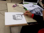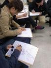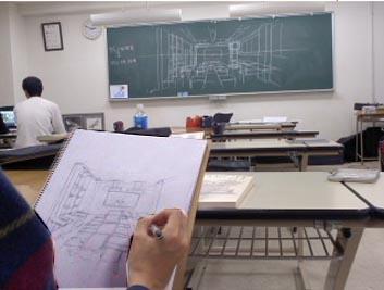 建築学科新1年生の第一回目のパースの授業風景です。 パースの最初の第一歩は上の写真のような1点透視図法を覚えることです。インテリアの奥行き方向の線は、すべて1点に集まります。これの理屈を覚えるには、実際の部屋を透視図法を使ってスケッチしてもらうのが1番。生徒さん達には、各々のスケッチブックに教室を1点透視図法を使ってスケッチしてもらいました。