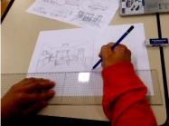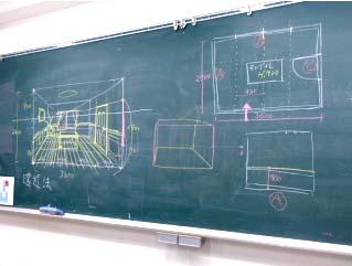内装の1消点図法です。全員に理解してもらえるよう、ゆっくり説明しながら、手順よく課題を進めてもらいました。どこかの大学のようにレオナルドダビンチが考案した透視図法を学問的に難しく教えると。学生達は、拒否反応を起こしパースぎらいになってしまうので、最初はできるだけシンプルな技法を学ぶことが大切です。難しく考える必要はありません。