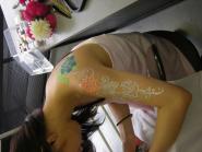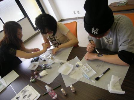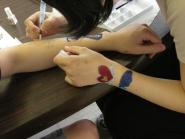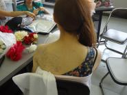 ファッションビジネス学科でボディージュエリー体験を行いました。 ボディージュエリーとは、肌に直接ラメなどで絵や模様を描くアクセサリーのことです。 豊富な色とキラキラが魅力でウェディングでも使われたりしています。